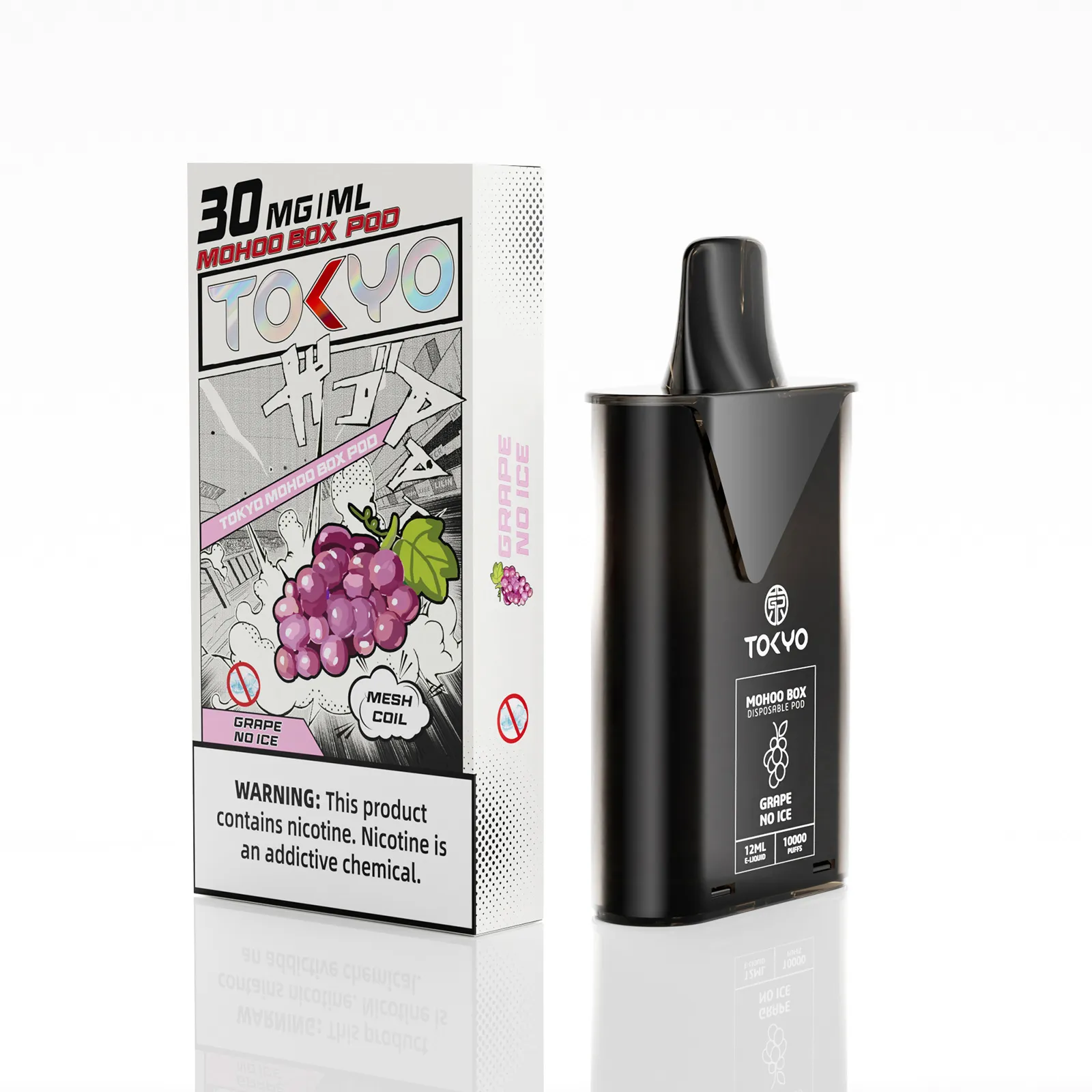 東京魔盒電子煙煙彈採用植物甘油與丙二醇基底,搭配高純度尼古丁鹽,容量12mL、尼古丁強度30mg/mL(3%),搭載1.0Ω鋼網棉霧化芯,設計為一次性pod,約10,000口,吸引力持久。